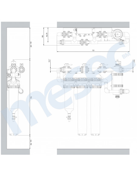 Metalni nosač, cijevna povezivanja s tri ventila, za montažu u by-pass način - omogućava jednostavno održavanje i zamjenu filterskih uložaka te UV sustava.